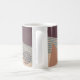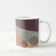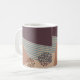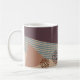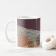 This mug has a mid-century modern abstract design of a blue line, a tan triangle, and a brown circle made of dots on a field of dark eggplant and cream. If you want the same design with different colors, message me.