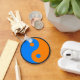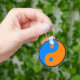 Yin Yang Schlüsselanhänger. Dieser Schlüsselanhänger ist mit einem Yin Yang-Symbol in Azurblau und Orange dekoriert. "In der Taoistischen Philosophie entstehen Yin und Yang aus einer anfänglichen Stille oder Leere zusammen und bewegen sich weiter zusammen, bis die Stille wieder erreicht ist. Wenn man zum Beispiel einen Stein in einen ruhigen Wasserpool fällt, wird man gleichzeitig Wellen und niedrigere Tröge zwischen ihnen erheben, und dieser Wechsel von Hoch- und Tiefpunkten im Wasser strahlt nach außen aus, bis sich die Bewegung löst und das Becken wieder ruhig ist. Yin-yang ist also immer entgegengesetzt und gleichberechtigt. Wenn eine Qualität ihren Höhepunkt erreicht, wird sie sich natürlich in die entgegengesetzte Qualität verwandeln: Getreide, das im Sommer seine volle Höhe erreicht (Volljang), produziert Samen und die im Winter (vollmundig) in einem endlosen Zyklus" - Wikipedia. Eine tolle Geschenkidee.