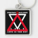 Schlüsselanhänger schwarz mit roter und weißer Grafik mit Y-NOT-ME Logo auf einem Dreieck ausgeglichen und mit "PERFECT BALANCE L O V E LIEBE IS THE KEY" und mit Y-NOT-ME Logo auf der Rückseite. Liebe ist ein Aktionsbegriff; sie wird gegen diese zersetzende Gier kämpfen, die in der Welt so weit verbreitet ist. Diese schreckliche Gier und Rassismus zerstören unsere Gesellschaft und auch unseren Planeten, sowohl im übertragenen Sinn als auch wörtlich.