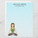 Stilvolle Vektor-Illustration einer schönen brünetten Frau, die Yoga macht. Die Frau sitzt in traditioneller Lotus-Position. Sie trägt ein grünes Panzeroberteil und eine dunkelgraue Hose. Der Hintergrund ist ein schöner blauer Verlauf. Es gibt auch Text, der "Yoga-Lehrer" zusammen mit einem anpassbaren Namen liest.