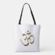 Yoga Gold Metallic Om Hindu Buddhist Symbol moderne weiße Tote Tasche. Om ist ein heiliges spirituelles Symbol, das für Gesang und Meditation im Hinduismus und Buddhismus verwendet wird. Karo der Erholung der Auflistung für die Zuordnung und Koordination von Elementen.