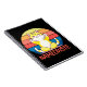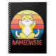 Farbenfrohe Illustration mit "Namowste" Textdesign und niedlicher Kawaii-Katze macht Yoga auf farbig gestreiftem Retro-Hintergrund