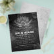Yoga Studio Meditation Instructor / Life Coach / Healer / Reiki Master / Massage Therapy Open House Flyer Template - Moderne elegante White Lotus auf Watercolor Schwarz Grunge Hintergrund.