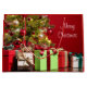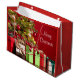 Yorkie oder Yorkshire Terrier, der Hund guckt aus den Weihnachtsgeschenken hervor, in der Hoffnung, einen Blick auf den Weihnachtsmann zu bekommen, niedliche große Weihnachtsgeschenktüte