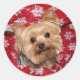 Yorkie, oder Yorkshire Terrier, hat in der Urlaubsgeschenkverpackung gespielt und sich niedlichen Weihnachtsaufkleber auf Herz und Nieren genossen