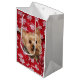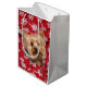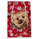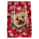 Yorkie oder Yorkshire-Terrier, Hund spielt glücklich mit der Weihnachtsgeschenkverpackung auf dieser niedlichen Hundeliebhaber Weihnachtsfeiertagsgeschenktasche