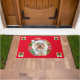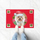 Ein bezauberndes Aquarellgemälde aus dem Gesicht eines Yorkie / Yorkshire Terrier Hundes mit einer niedlichen Weihnachtsmannmütze. Er/sie ist gerahmt von einem Weihnachtskranz mit Poinsettias. Kiefernzapfen, Orangenbeeren und Kiefernnadeln und in jeder der vier Ecken ist ein weißer Platz mit einem Haufen Kiefernäste und drei Kiefernzapfen. Feiern Sie diese Feriensaison mit Ihrem Lieblingshund Zuhause Zubehör.