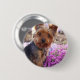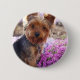 Yorkie's sind sehr spezielle kleine Hunde mit großer Persönlichkeit. Dieses Foto ist von einem sehr frechen kleinen Mädchen, das in einem Bett aus violetten Blumen sitzt.