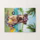 Yorkshire Terrier Hund sitzend in der Nähe von Campingzelt und Camper-Van im Hintergrund am Flussufer ist ein perfektes Rätsel, wenn Sie zum Camping gehen.
