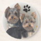 Zwei Yorkshire Terrier Welpen-Pose für die Kamera und auf einem runden Untersetzer das ideale Geschenk für die Yorkie Mama oder den Vater.