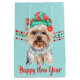 Ein niedlicher Yorkshire Terrier Hund trägt einen roten und grünen Weihnachtshut vor den Fäden der roten und grünen Weihnachtsperlen auf beiden Seiten dieser Geschenktasche. Im unteren Bereich befinden sich Textfelder, die rot für Ihren eigenen Text passen. Derzeit sagt eine Seite "Frohe Weihnachten" und die andere Seite sagt "Frohes Neues Jahr", aber Sie können sie ändern, wenn Sie möchten. Die Bilder und der Text werden auf einem helleren, minzgrünen Hintergrund platziert. Schauen Sie sich die passenden Produkte in unserem Shop an.