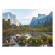 Ein atemberaubender Panoramablick auf das Yosemite-Tal, der die ikonischen Granitfelsen von El Capitan und die Half Dome zeigt. Im Vordergrund befindet sich ein ruhiger Fluss, der sich durch eine Wiese schlängelt, mit glatten Felsen und üppig grünen Gräsern übersät ist. Der Himmel ist weich blau, mit weich gezogenen Wolken, die die ruhige Atmosphäre verstärken.