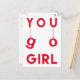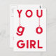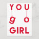 NewParkLane - Postcard, mit dem Zitat 'You Go Girl' in einer lustigen, modernen Typografie mit hängenden Buchstaben, in leuchtendem Rot. Die Rückseite sagt: Zeige Krebs, der Chef ist! Fügen Sie Ihren Namen oder einen anderen Text für ein personalisiertes Design hinzu. Eine moderne, motivierend und aufregende Karte für ein wenig Unterstützung und Ermutigung für Ihren Lieben, der gegen Krebs kämpft! Karo in dieser Sammlung zur Krebsbekämpfung für mehr Karten und Geschenke für Patienten, Krebspatienten und medizinisches Personal.