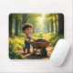 Ein fröhlicher kleiner Junge drückt eine Schubkarre mit einem kleinen Baum, der durch einen sonnenverwinkelten Waldweg schleicht
