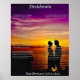 Die vollständige Desiderata von Max Ehrmann: Gehe ruhig inmitten des Lärms und der Eile. ist ein Foto einer Silhouette eines jungen Paares in der Liebe, das am Meeresufer mit dem wunderschönen, lila, orangefarbenen und gelben Himmelslicht steht.Die vollständige Desiderata ist ein beliebtes Gedicht Das Lieblingsgedicht von Max Ehrmann 1872-15 illustriert mit den leuchtenden Farben, die vom Wasser reflektieren.