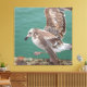 Eine Möwe mit braunen und weißen Federn steht auf einem verwitterten Steg, seine Flügel breiten sich aus, als ob sie sich auf den Flug vorbereiten. Der Kopf des Vogels wird zur Seite gedreht, der gelbe Schnabel leicht geöffnet. Im Hintergrund herrscht ein aquamariner Ozean, der eine ruhige und friedliche Atmosphäre schafft.