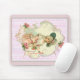 Young Marie Antoinette mit einem Federhut gerahmt mit Rollen und Rose. Der Hintergrund ist rosa Streifen.
