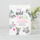 Set den Ton für Ihr Party mit diesen eleganten Einladungen mit einem Party Animals Young Wild and Three Thema. Für Mädchen zum Geburtstag.