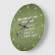 This custom wall clock features a fun fly fishing wish typography: 'May your waders never leak, and you always have a tight line!', with the silhouette of a fly fisherman with a tight line! The textured background is a beautiful green reminiscent of a clear mountain stream, but can be removed to add a background color. There are 4 clock numbers and crescent moon symbols to represent the numbers. Perfect for the fly fishing enthusiast in your life. There are other clock shapes and sizes to choose from.
