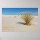 Das Bild zeigt eine ruhige Landschaft des Nationalparks der Weißen Sande, mit wundenden weißen Sanddünen unter einem klaren, blauen Himmel. Mehrere Yucca-Pflanze verdecken die Landschaft und fügen eine subtile Farbe und Textur hinzu.