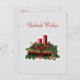 Zwei rote Kerzen sind umgeben von festlicher Vegetation, Kiefernzapfen und roten Beeren auf einem dekorativen Baumstamm. Ein leuchtender Effekt hebt das Arrangement-Set vor einem grauen Hintergrund hervor.