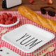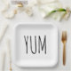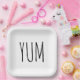 Zeitgenössischer schwarzer YUM-Text auf weißem Hintergrund. Die Hintergrundfarbe kann geändert werden. Text ist bearbeitbar.