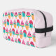 Toilettenbeutel mit einer Abbildung von 3 verschiedenen Eis-Leckereien. Ein blaugrüner Popsikel mit Erdbeertropfen und bunten Sprinklen. Ein Wassermelone-Popsikel. Ein Kegel mit Lagen von leckerem Eis in Rosa und Minze. Alles mit niedlichem Kawaii lächelt.