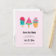 Save the Date Postkarte mit einer Abbildung von 3 verschiedenen Eiscreme-Leckereien. Ein blaugrüner Popsikel mit Erdbeertropfen und bunten Sprinklen. Ein Wassermelone-Popsikel. Ein Kegel mit Lagen von leckerem Eis in Rosa und Minze. Alles mit niedlichem Kawaii lächelt.