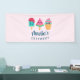 Business-Banner mit einer Abbildung von 3 verschiedenen Eis-Leckereien. Ein blaugrüner Popsikel mit Erdbeertropfen und bunten Sprinklen. Ein Wassermelone-Popsikel. Ein Kegel mit Lagen von leckerem Eis in Rosa und Minze. Alles mit niedlichem Kawaii lächelt.