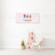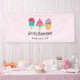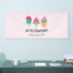 Business-Banner mit einer Abbildung von 3 verschiedenen Eis-Leckereien. Ein blaugrüner Popsikel mit Erdbeertropfen und bunten Sprinklen. Ein Wassermelone-Popsikel. Ein Kegel mit Lagen von leckerem Eis in Rosa und Minze. Alles mit niedlichem Kawaii lächelt.