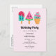 Geburtstags Einladung Postkarte mit einer Abbildung von 3 verschiedenen Eiscreme-Leckereien. Ein blaugrüner Popsikel mit Erdbeertropfen und bunten Sprinklen. Ein Wassermelone-Popsikel. Ein Kegel mit Lagen von leckerem Eis in Rosa und Minze. Alles mit niedlichem Kawaii lächelt.