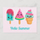 Eine Postkarte mit einer Abbildung von 3 verschiedenen Eiscreme-Leckereien. Ein blaugrüner Popsikel mit Erdbeertropfen und bunten Sprinklen. Ein Wassermelone-Popsikel. Ein Kegel mit Lagen von leckerem Eis in Rosa und Minze. Alles mit niedlichem Kawaii lächelt.