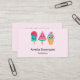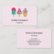 Visitenkarten mit einer Abbildung von 3 verschiedenen Eiscreme-Leckereien. Ein blaugrüner Popsikel mit Erdbeertropfen und bunten Sprinklen. Ein Wassermelone-Popsikel. Ein Kegel mit Lagen von leckerem Eis in Rosa und Minze. Alles mit niedlichem Kawaii lächelt.