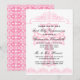 Erste Einladungen der heiligen Kommunion kennzeichnen einen Querentwurf mit Kalligraphiegrenzen und mehrfachen Textfeldern, die Sie mit Ihren persönlichen Details über die Front, während die Rückseite ein Damastmuster in einer Farbpalette von rosa hat, schwarz, und Weiß besonders anfertigen können.