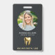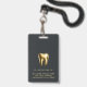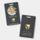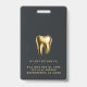 Modernes, berufliches und elegantes Foto-ID-Abzeichen für Zahnärzte. Dieses Design verfügt über ein Single-Foto, Namen, Titel und Firmennamen auf der Vorderseite, ergänzt durch ein goldenes Zahnlogo auf dunklem Hintergrund. Die Rückseite wird mit Ihrer Adresse personalisiert. Dieses ID-Abzeichen eignet sich hervorragend für Zahnarztmitarbeiter und bietet ein ausgeklügeltes und einheitliches Aussehen für Ihr Team.