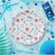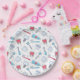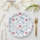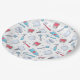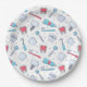 Papier Teller mit einem Dentalmotiv. Mit bunten Illustrationen von Zähnen, Zahnbürsten und verschiedenen Zahnwerkzeugen.