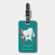 Ein Gepäckanhänger mit einer Abbildung eines großen weißen Zahnes im Stil eines Cartoon, der sich glücklich an einer roten Zahnbürste hält und dem Daumen ein Schild nach oben gibt.