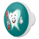 Keramik Türknauf mit einer Abbildung eines Cartoon Stil große weiße Zähne lächeln glücklich halten eine rote Zahnbürste und geben den Daumen nach oben Zeichen. Grüner Hintergrund.