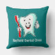Ein personalisiertes Kissen mit einer Abbildung eines Cartoon wie ein großer weißer Zahn, der mit einer roten Zahnbürste fröhlich lächelt und den Daumen nach oben zeigt. Dunkelgrüner Hintergrund.