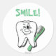 Niedlicher Aufkleber mit Cartoon-Zahn mit grüner Zahnbürste auf weißem Hintergrund.