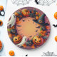 Dieser lebhafte Kranz mit Halloween-Thema besticht durch einen zentral geschnitzten Kürbis mit leuchtendem Gesicht, überragt von einem Hexenhut. Um den Kürbis herum befinden sich zwei verspielte weiße Geister, Herbstblätter in Orange- und Gelbtönen, schwarze Spinnen, Spinnennetze und kleinere Kürbis. Der Hintergrund zeigt einen Farbverlauf in lila Farbtönen, der den festlichen Halloween-Geist verstärkt. Dieses Design eignet sich perfekt für saisonale Dekorationen oder Halloween-Veranstaltungen.