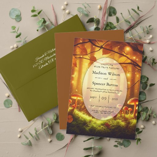 Treten Sie ein in ein Märchen mit dieser romantischen, verzauberten Waldhochzeit, die mit einem traumhaften goldenen Dämmerglühen, zauberhaften Glühwürmchen und glühenden Pilzen in üppigen Moos aufwartet. Dieses Design ist perfekt für Paare, die den Zauber der immerwährenden Liebe gewollt haben und rustikalen Holzcharme mit ätherischer Romantik verbinden. Ideal für Herbsthochzeiten, Waldfeiern oder Candlelit-Abend-Zeremonien, Set für eine Nacht voller Wunder, Schönheit und Liebe. Personalisieren Sie Ihre Daten, um sie einzigartig zu machen.
