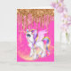 Ein wunderschönes und zauberhaftes, mit Augen, weißes Einhornpony mit langen, bunten Haaren hat ihre hübschen Flügel offen und ist stehend auf Imitaten glitzernden Märchenstaub. Sie ist gerahmt von einem heißen rosa Hintergrund, der Imitate Gold und rosa Glitzer Drippings hat. Diese sind ideal für Ihre Tochter, Enkelin, Paten oder Nichte zum Geburtstag.