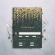 Eine skurrile Illustration von üppig hängenden Weinreben, die mit Gold (digitaler Effekt, nicht echte Folie!) über einem glitzernden smaragdgrünen Aquarellhintergrund, glitzernd mit Feenlampen und magischem Staub, dekoriert diese Sommer-Hochzeit im Herbst im Winter RSVP-Karte mit einem verzauberten Waldthema. Eine elegante, moderne Antwortkarte für eine märchenhafte Hochzeit. Ideal für Brautpaare, die die märchenhafte Waldlandschaft, den Märchenwald oder den Märchengarten mit smaragdgrünen, mauvischen und goldenen Lieben geniessen.