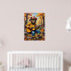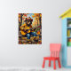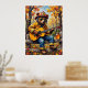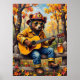 Dieses wunderbare Bild zeigt einen Bären, der als Feuerwehrmann verkleidet ist, eine Sonnenbrille und einen Helm trägt, eine akustische Gitarre schlüpft und auf einem verwitterten Holzzaun steht. Der Hintergrund ist ein lebendiger Herbstwald mit Bäumen in voller Laub und verstreuten Blätter auf dem Boden. Ein Glas goldener Honig wird daneben auf einem Zaunpfosten platziert. Die dicken, strukturierten Pinselstriche verstärken den whimsikalen und süßen Charakter der Szene, wobei "Liebe My Honey" hervorgehoben dargestellt wird.