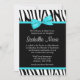 Ein trendiges schwarz-weißes Zebramuster mit aquamariner blauer Bogen-Grafik wird auf dieser lustigen Bat Mitzvah Einladung vorgestellt. Designs sind gedruckte Illustrationen/Grafiken - NICHT AKTUELLES RIBBON.