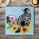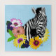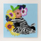 Ein Zebra mit afrikanischen Gänseblümchen vor blauem Hintergrund