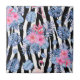 Ein modernes Schwarz-Weiß-Zebraprint überlagert mit einem tropisch-rosa und blauen Hibiskus und Flamingo-Muster.