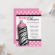 Stilvolle Baby Shower Einladungen mit weißen Polka-Punkte über rosa und mit einer zebra-gedruckten Babyflasche.