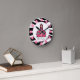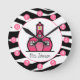Eine Uhr mit Zebradruck-Design und dem Logo des Pink Schoolhouse. Personalisieren Sie Ihren Namen unter Schulhaus. Die Uhr zeigt weiße Zahlen auf rosa Punkten.